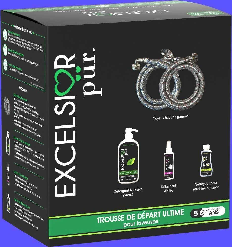 The Excelsior Pür Ultimate Starter Kit provides everything needed for premium laundry performance and long-term washer protection. This all-in-one bundle includes a pair of premium stainless-steel washer hoses, a pair of premium stainless-steel steam dryer hoses, 950 ml 7.5x concentrated laundry detergent (79 loads), 120 ml stain remover, 250 ml machine cleaner, and a water leak detector for added safety. Available in Fresh Scent or Unscented.Read More