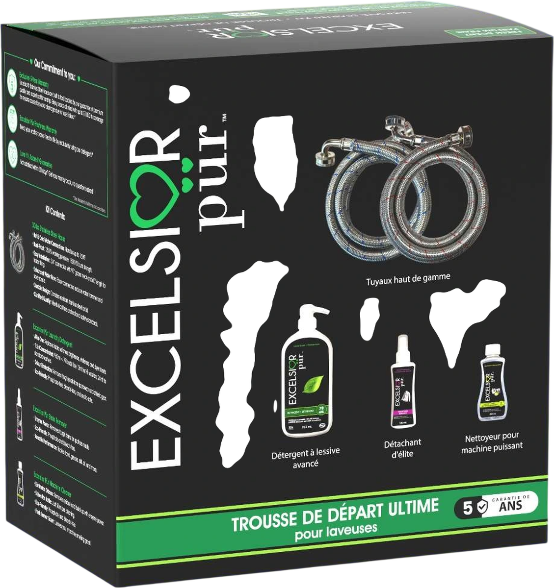 The Excelsior Pür Ultimate Starter Kit provides everything needed for premium laundry performance and long-term washer protection. This all-in-one bundle includes a pair of premium stainless-steel washer hoses, 950 ml 7.5x concentrated laundry detergent (79 loads), 120 ml stain remover, 250 ml machine cleaner, and a water leak detector for added safety. Available in Fresh Scent or Unscented.Read More